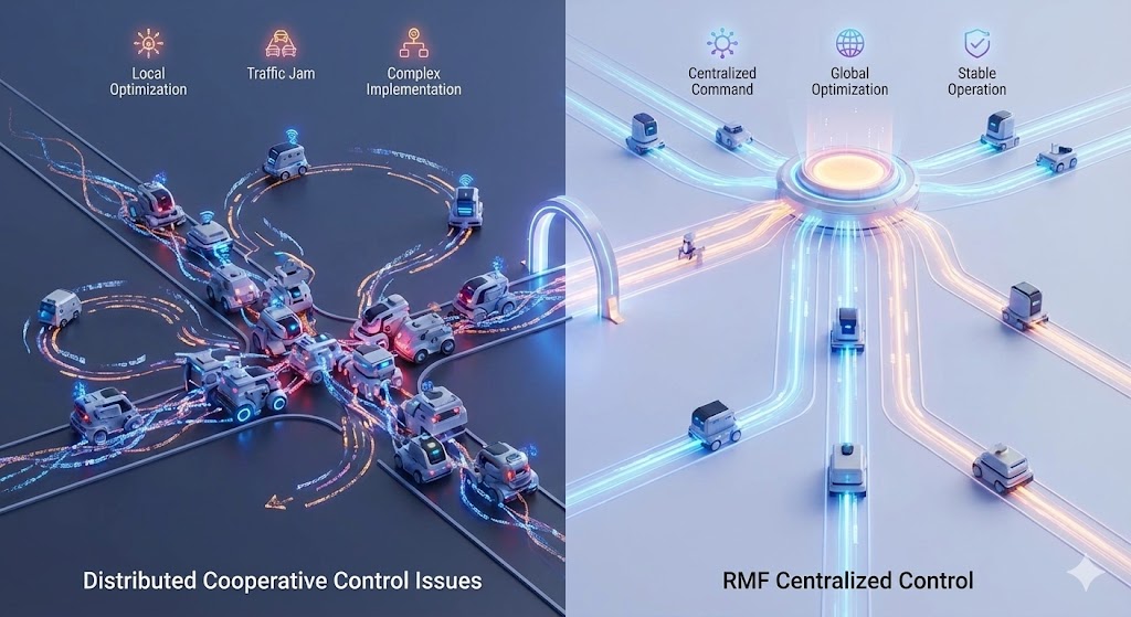 RMFは“司令塔”が全体を把握し、複数ロボットの行動を一元判断・指示する方式である”集中管理制御方式”を採用していた。
